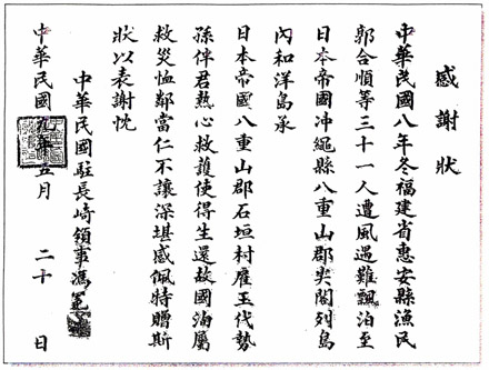 「民国八年に中国漁船が嵐?で日本領の尖閣列島に漂着した際、
